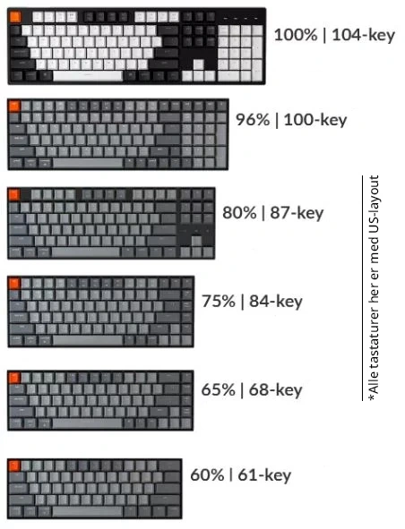 På billedet forneden kan du se de forskellige størrelser, der findes. Til kontorarbejde anbefaler man oftest 100%/Full Size, så man også har numpad med. Gamere køber oftest mindre tastaturer, såsom 75% (TKL) og helt ned til 60%.